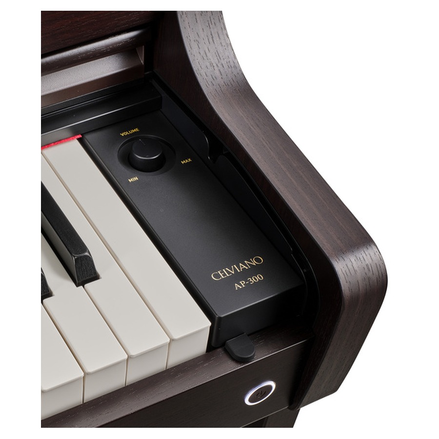 Tri integrisane pedale (sustain, sostenuto i soft) i poklopac za dirke čine AP-300 kompletnim kabinet instrumentom bez potrebe za dodatnom opremom.