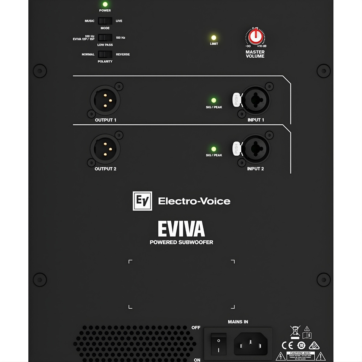 Robusni 18” subwoofer sa kućištem od šperploče poseduje pojačalo snage 1000 W i analogni ulaz sa dva kanala. Intuitivni kontrolni panel ima potenciometar za podešavanje nivoa, kao i prekidače za izbor režima MUSIC ili LIVE, low-pass filtraciju između 100 Hz (za EVIVA 12P/15P) i 150 Hz, kao i polaritet između NORMAL i REVERSE. Subwoofer se napaja preko IEC priključka sa automatskim prebacivanjem univerzalnog napona 100 V ~ 240 V – kabl za napajanje je uključen (zavisi od regiona).