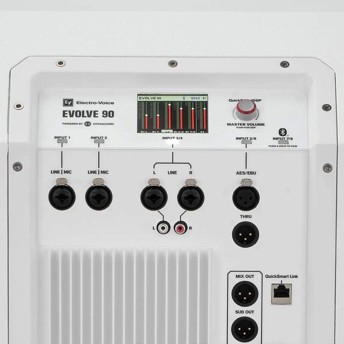 Kao najveći zvucni sistem u EVOLVE porodici, EVOLVE 90 obezbeđuje široke mogućnosti povezivanja: XLR/TRS combo Mic-Line ulaze, XLR i RCA linijske ulaze, digitalni AES/EBU kao i Bluetooth konekciju. Potpuna kontrola moguća je i preko aplikacije QuickSmart Mobile App, koja omogućava bežično upravljanje i integraciju sa drugim EV zvučnicima.
