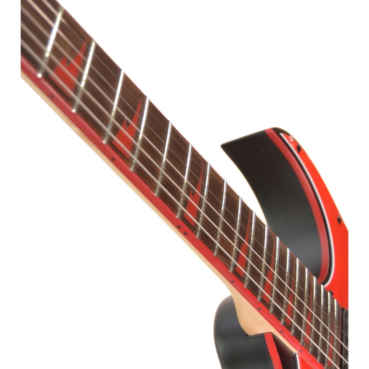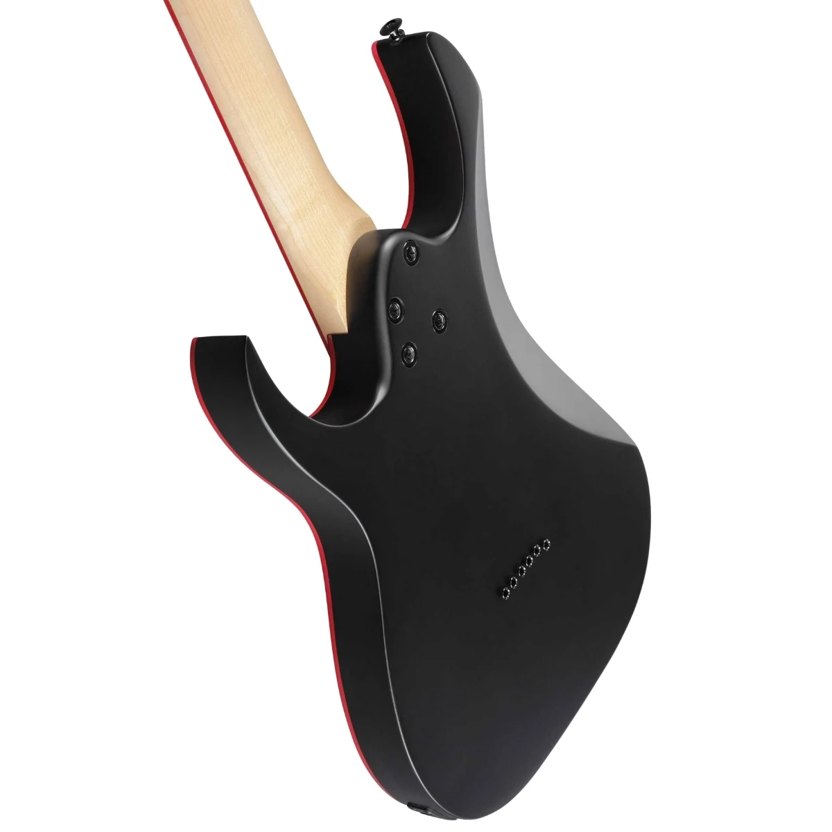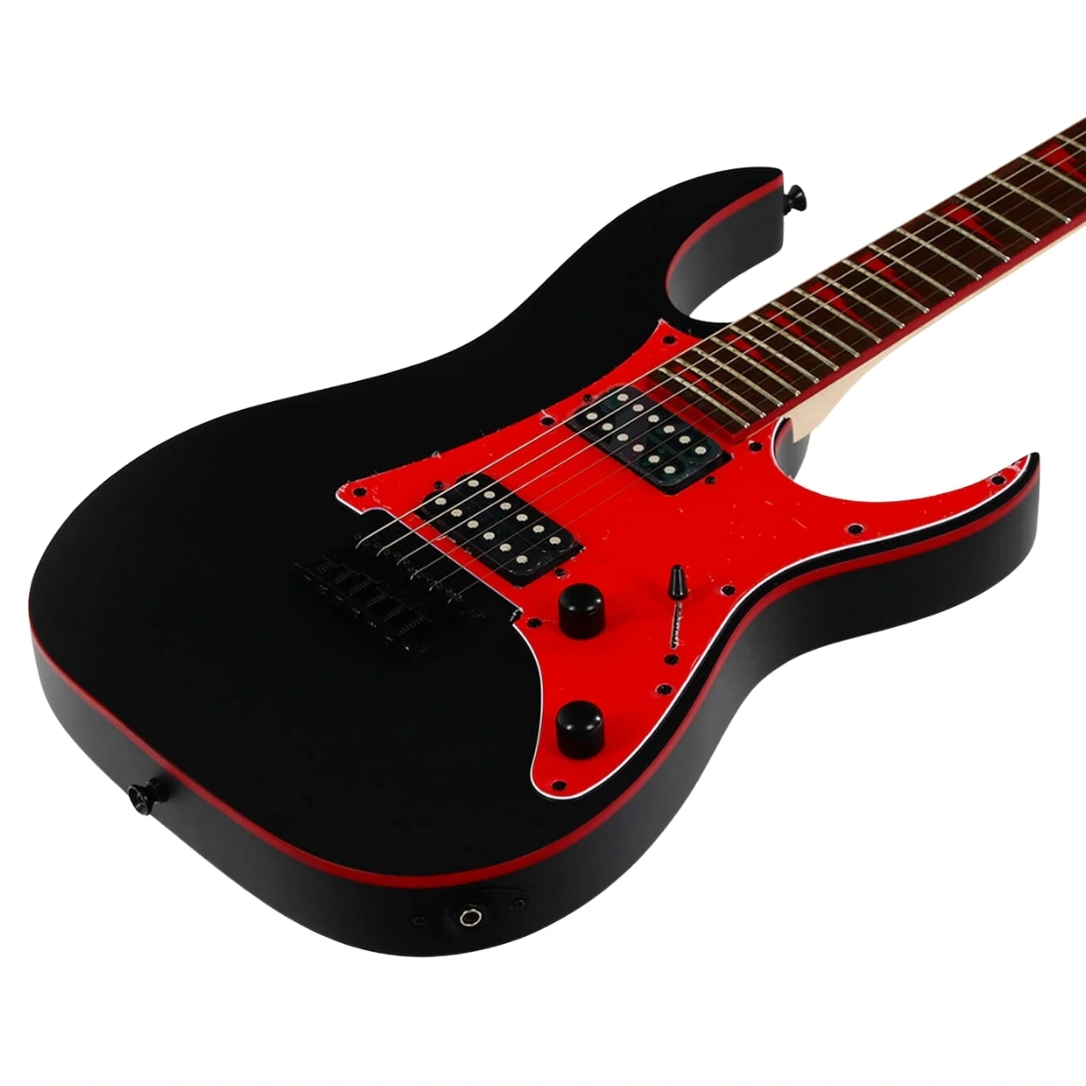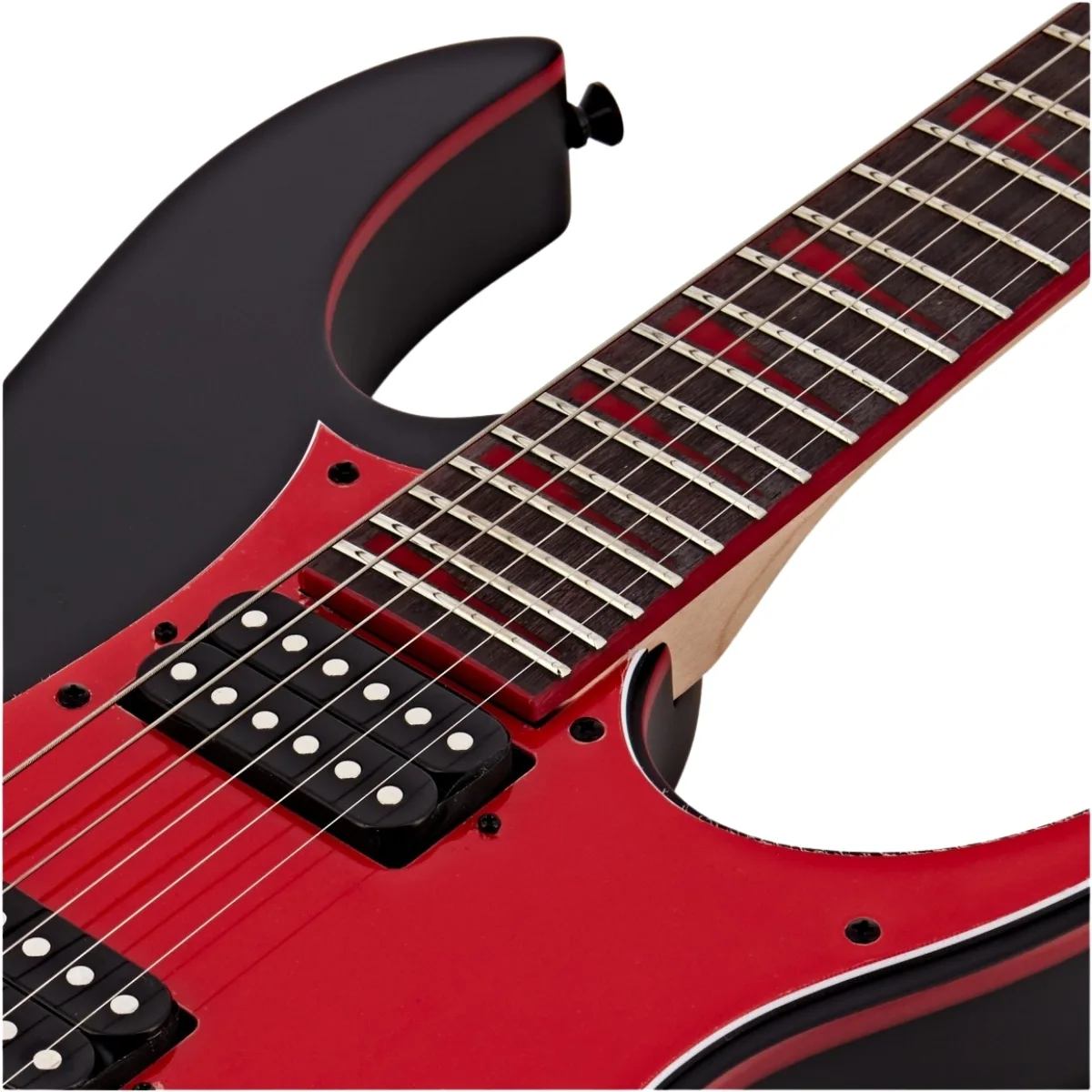 Dizajn modela GRG131DX je u duhu stalno popularnog RG oblika, uz moderan black flat finiš i atraktivne detalje crvenog binding-a i shark-tooth inlay-a, što dodatno ističe vizuelni identitet.