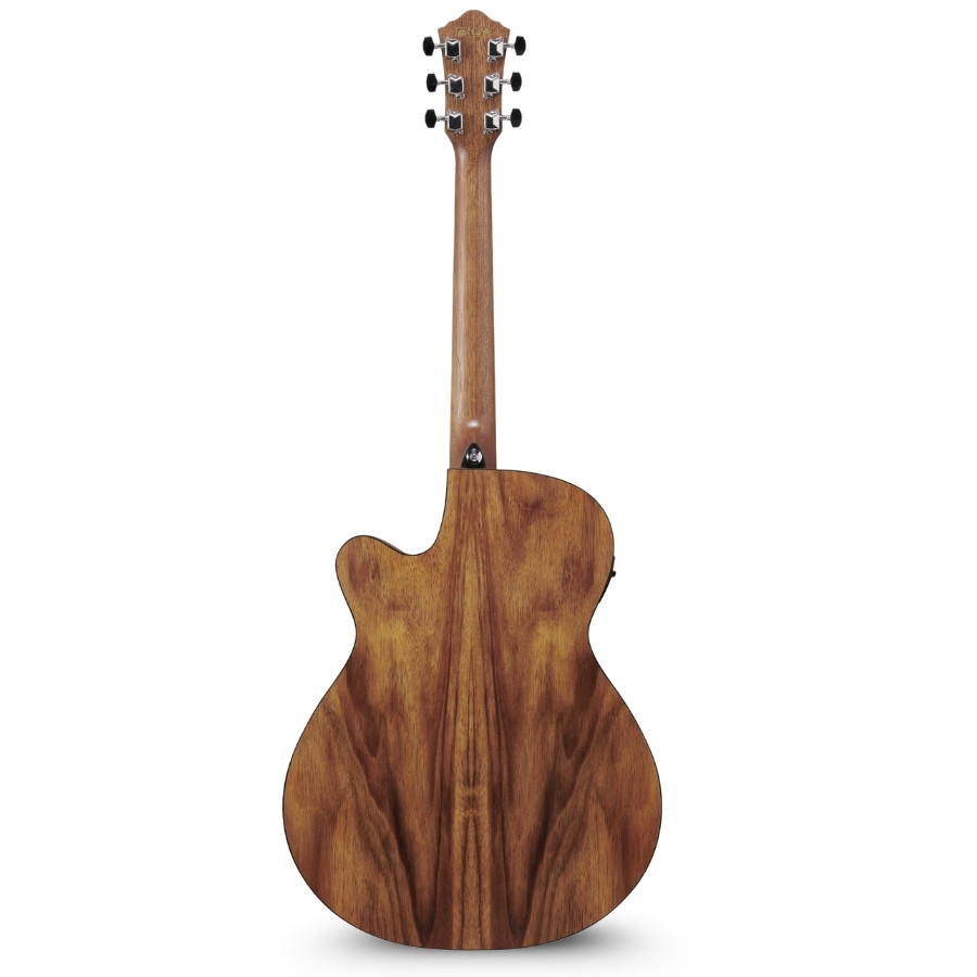 Tijelo je potpuno izrađeno od White Siris drveta, vrste koja daje egzotičan izgled sa bijelim nijansama i svijetlim žilicama. Cutaway dizajn otvara pristup visokim pragovima, dok Grand Concert format održava umjerene dimenzije prilagođene sviranju sjedeći. U Open Pore Brown finišu, prirodna tekstura ostaje vidljiva uz topao smeđi prelaz.