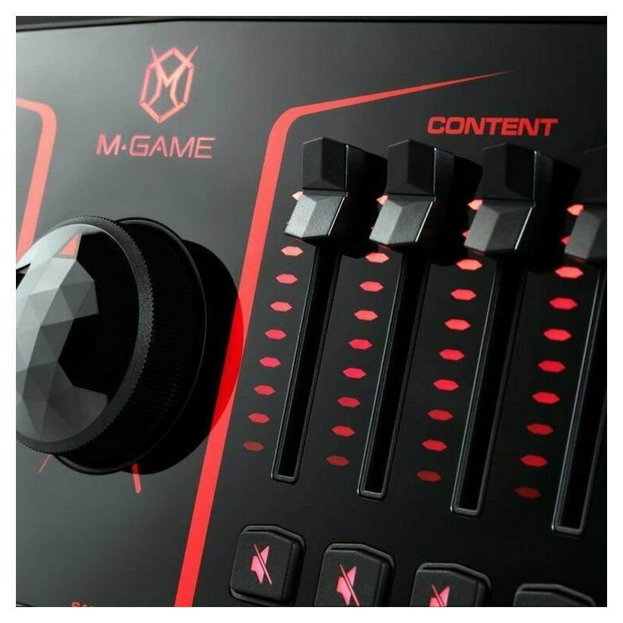 Prilagodite intenzitet i obrazac LED osvjetljenja po želji. M-Game softver omogućava podešavanje mikrofona, rutiranje ulaza i izlaza, kreiranje virtuelnih mikseva, kao i uvoz i dodjelu slika semplovima i efektima.