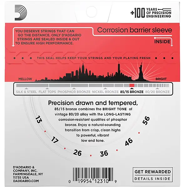 85/15 bronzana žica precizno je namotana na pažljivo izvučenu, heksagonalno oblikovanu karbonsko-čeličnu jezgru, što rezultira dugotrajnim, svijetlim tonom i izvrsnom intonacijom.